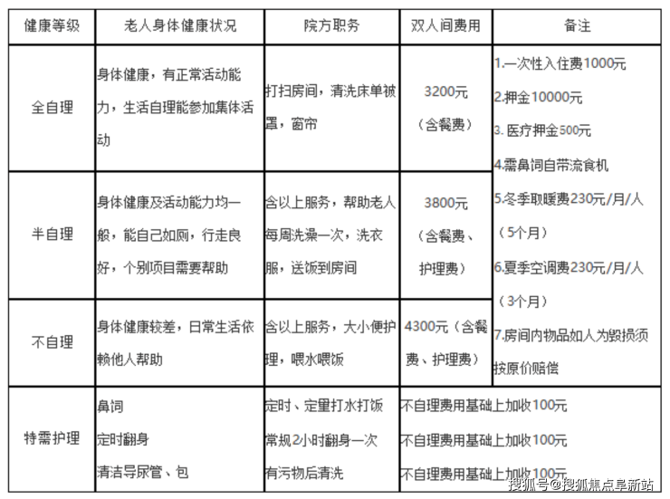 注:“床位费1000元/月起”指多人间床位基础费用,需叠加护理与餐费。