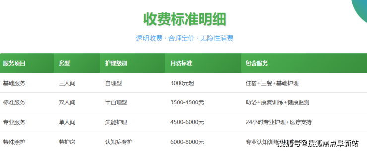 参考收费起价:3000元/月起。此为基础月费起点,根据长者不同的照护需求等级,费用会进行合理调整。
