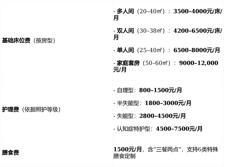 采用“基础床位费 + 分级护理费 + 膳食费”模块化透明计价,所有费用经民政部门备案公示,无隐性消费。