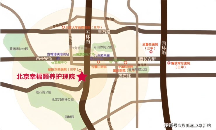 (一)地理位置优越:机构坐落于石景山区古城街道人民渠北侧路6号,临近首钢园区与石景山游乐园,环境清幽,空气清新,远离主干道噪音,适合长者静养。