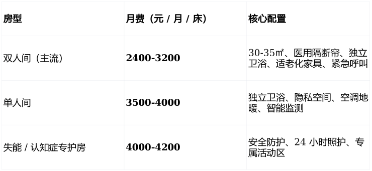 采用 **“床位费 + 分级护理费 + 餐费”** 全包式计价,2400-4200 元 / 月,无会员费、无强制捆绑。