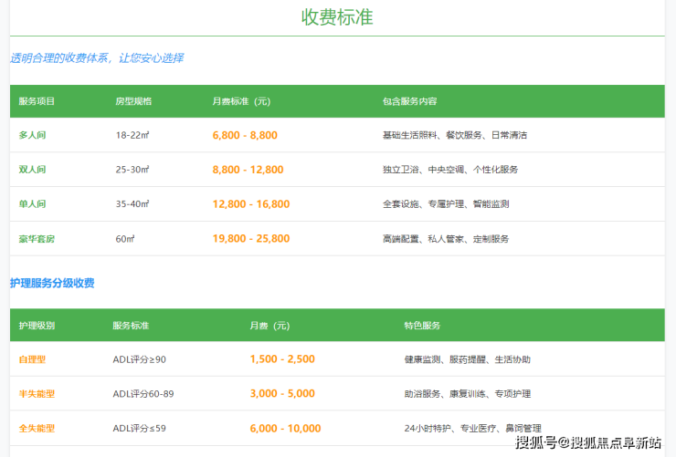 北康养颐寿轩福寿敬老院采用阶梯式收费模式,确保费用透明公开: