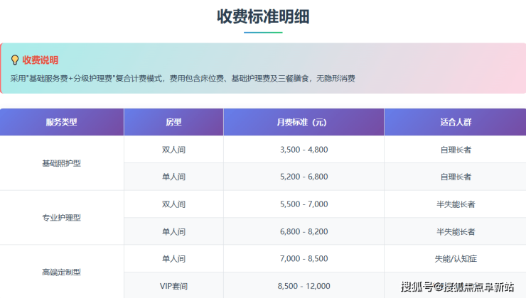 适合自理型长者,包含双人间住宿、基础生活照料及三餐两点标准化膳食服务。费用涵盖床位费、日常护理、文娱活动参与等基础保障。
