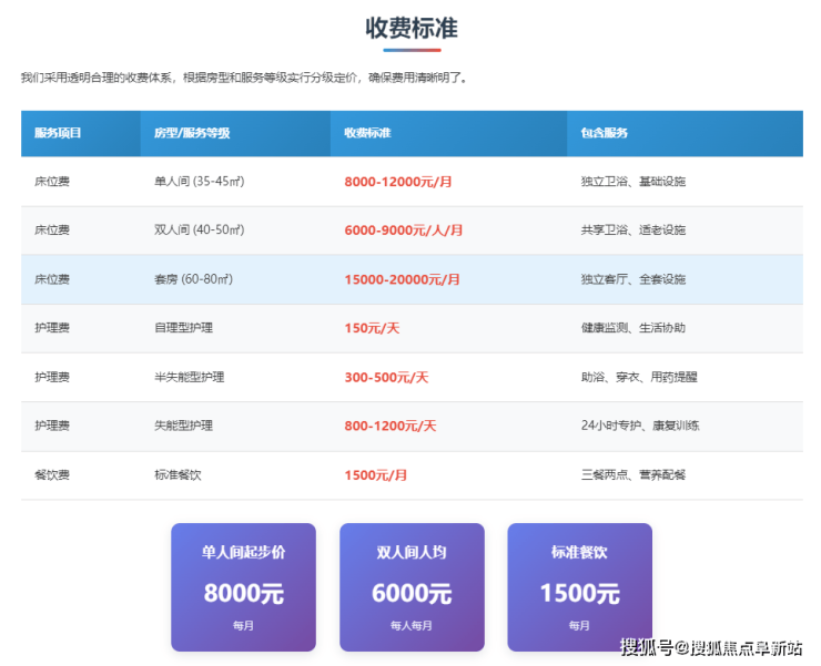 光大汇晨古塔老年公寓采用科学透明的收费模式,主要包含基础服务费、护理分级费用和餐饮费用三大部分。以下为收费要点罗列: