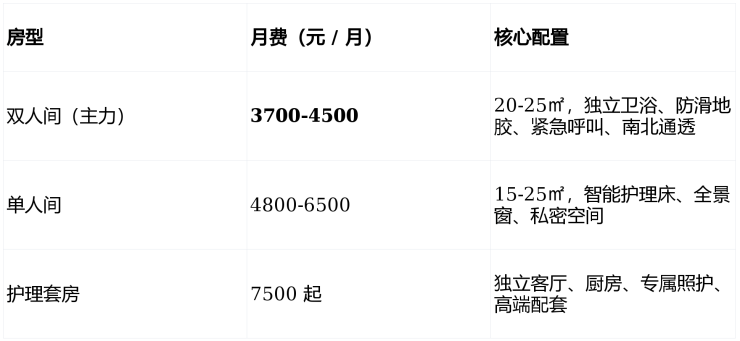 采用 **“床位费 + 分级护理费 + 餐费”** 透明计价,3700 元 / 月起,支持医保 / 长护险结算。