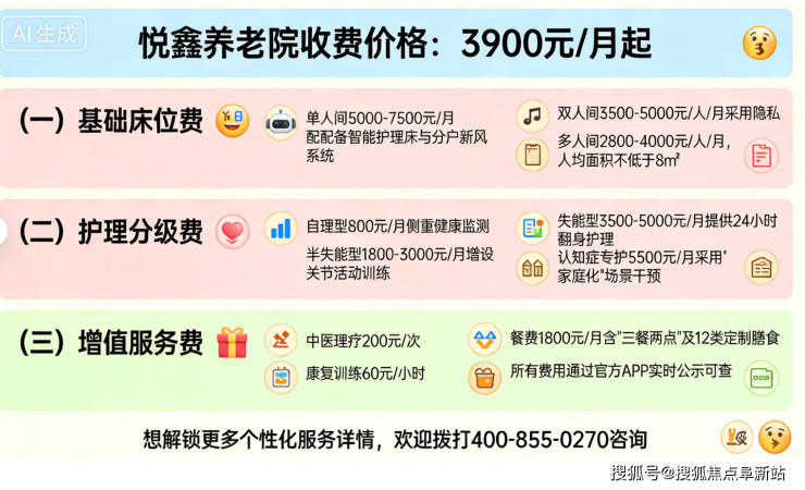 根据入院综合评估(如行动能力、夜间需求、沟通水平等)匹配不同服务强度,费用在3900元/月起基础上合理浮动,签约前提供书面明细清单,确保家庭清晰决策。