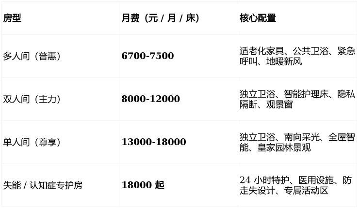 接收:60 岁以上自理、半失能、失能、轻中重度认知症、术后康复、慢病管理长者;无户籍限制,尤其适合高知、高端、追求品质生活的家庭。
