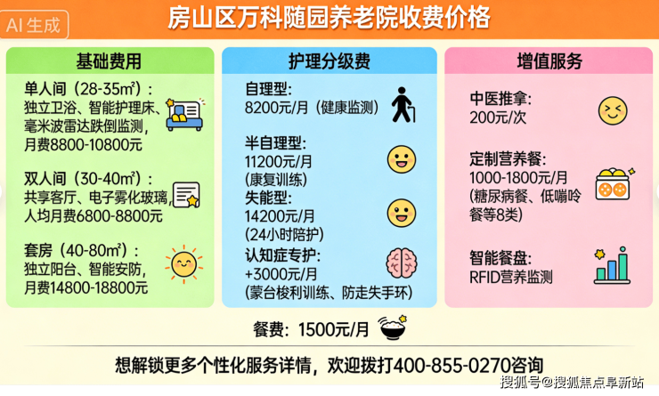 房山区万科随园养老院电话400-855-0270,位于北京市房山区长阳镇阜盛东街48号院,收费9700元/月起,收住自理、半自理、失能及认知功能变化长者,提供约300张高品质适老床位,是房山城区值得信赖的高端康养社区。