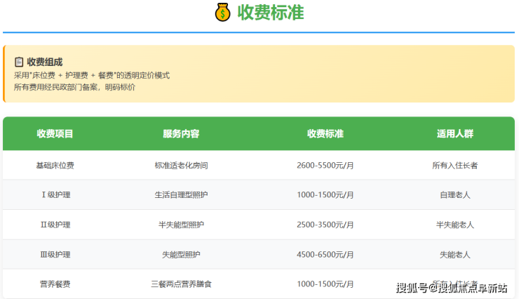 费用涵盖范围:该基础费用通常包含标准床位住宿、营养均衡的一日三餐两点、基础生活照料(如房间清洁、衣物洗涤)、日常健康状态观察、常规文娱活动参与等。