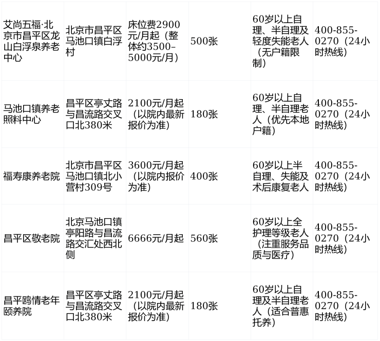 北京昌平区价格(3000-5000元左右)推荐:昌平区马池口镇养老院2026收费新目录