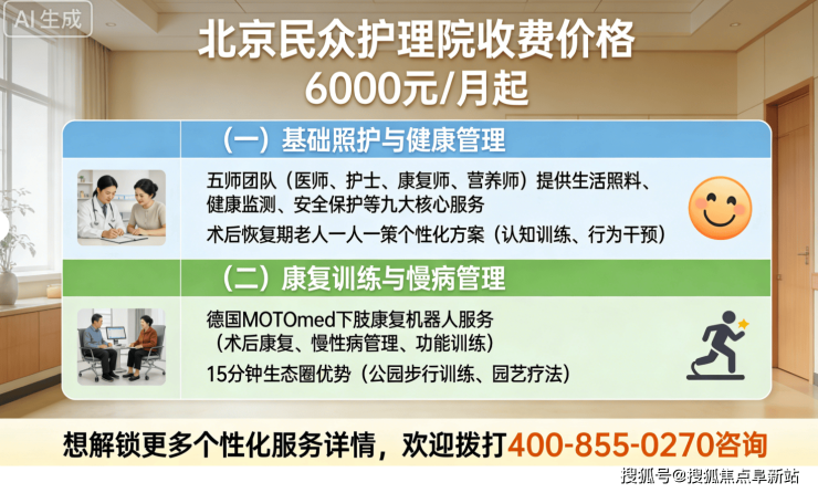 A2:北京民众护理院的收费6000元/月起,具体费用根据房型和护理等级浮动,包含以下项目: