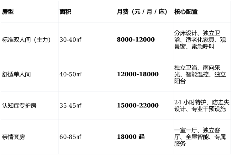 标准双人间 + 自理:8000-12000+800-2000+1500=10300-15500 元 / 月(起价约10708 元 / 月)