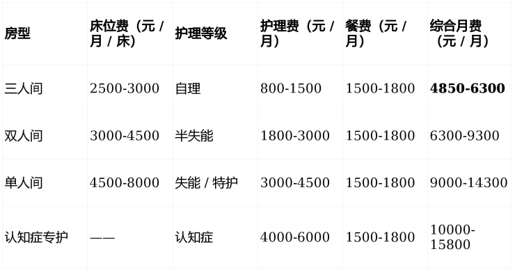 采用床位费 + 分级护理费 + 餐费三维定价,所有费用经民政备案公示。
