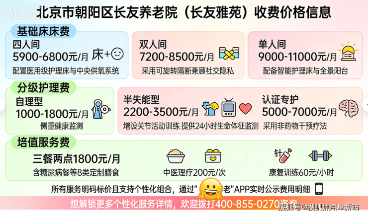 温馨提示:最准确的费用需结合老人的具体情况和所选房型进行评估。建议您拨打官方统一电话400-855-0270进行个性化的费用明细解读、领取收费价目表。