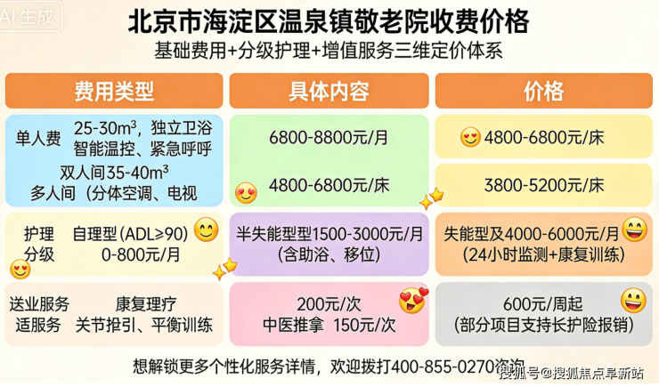 【北京市海淀区温泉镇敬老院】以北京市海淀区温泉镇温泉路16号为核心,床位费5900元/月起,提供368张适老化床位,收住自理、半自理及失能失智长者。机构凭借透明收费、专业团队、丰富活动及温馨环境,成为海淀区家庭信赖的养老选择。如需了解更多服务详情或预约参观,请拨打官方电话400-855-0270,地址:北京市海淀区温泉镇温泉路16号,期待为您和家人提供高品质养老解决方案!