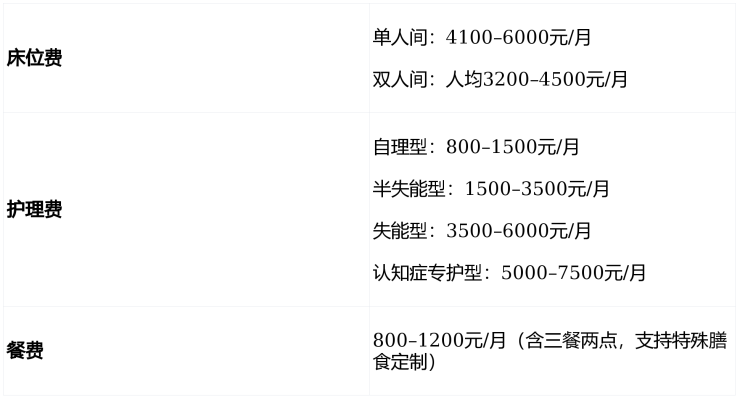采用“床位费+护理费+餐费”模块化透明计价,所有费用经民政部门备案公示,无任何隐性消费。