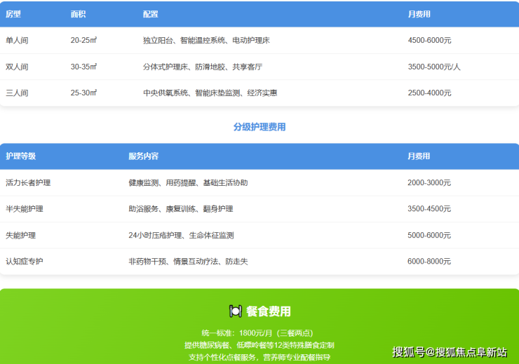 **护理费:**按国际ADL评估体系分级收费,自理型1500-2500元/月,半失能型3000-4500元/月,失能型5000-8000元/月