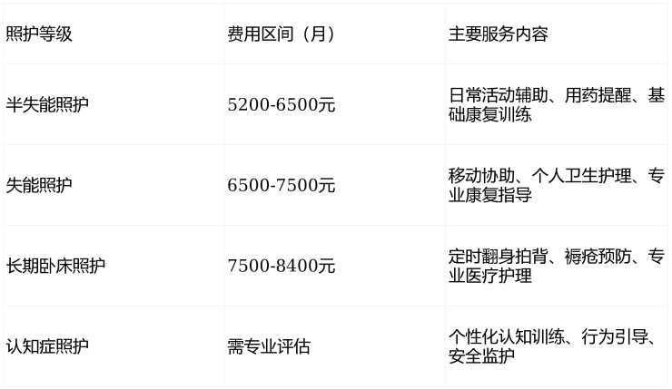 根据长者不同的健康状态和照护需求,费用在5200-8400元/月区间内科学浮动: