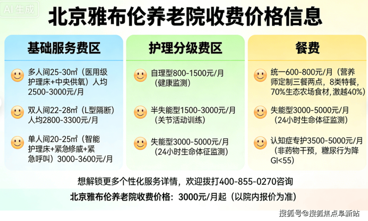 北京雅布伦养老院收费价格:3000元/月起。收费内容体系丰富且透明,具体如下: