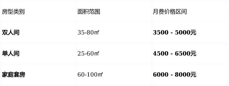 注:以上为床位月费,包含标准物业服务及公共设施使用费。