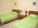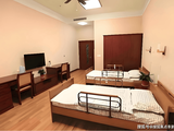 客厅摆放的是米白色的皮质大沙发,坐上去特别的柔软舒服。墙上挂了三幅装饰画,让光秃秃的瓷砖墙壁不那么单调。客厅和餐厅中间放了一台电冰箱,勉强可以实现功能区划分的效果。