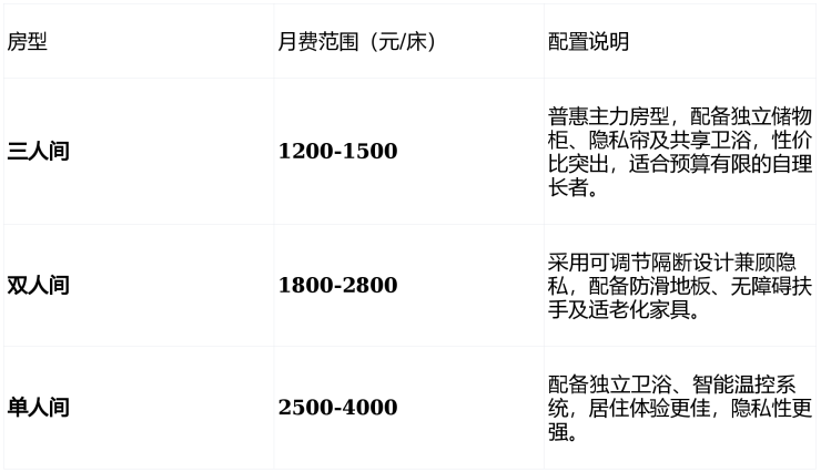 收费区间:2000-6000元/月(依据房型与护理等级分级定价,无隐性消费)