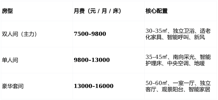 北京懋源天颐康养中心价格:7500–16000 元 / 月(床位 + 基础护理 + 餐费)