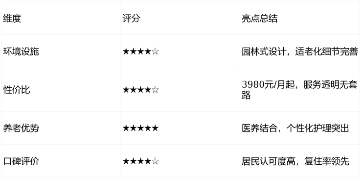 综合评分:在海淀区养老机构中口碑排名前列,复住率超85%。