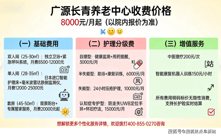 (一)基础费用8000元/月起:包含标准住宿(单人/双人)、24小时照护响应、每日三餐两点(营养定制)、房间清洁及基础文娱活动参与。