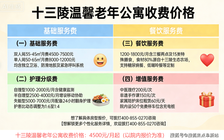 (一)基础月费4500元/月起:适用于标准双人间,包含住宿、一日三餐两点、基础生活协助、公共区域清洁及日常活动参与,是昌平西部极具性价比的养老选择。