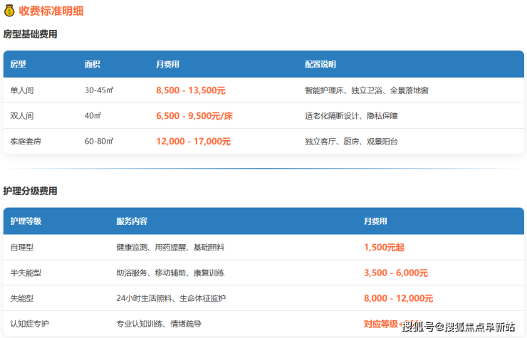 单人间:8500-13500元/月(配备智能护理床、独立卫浴)